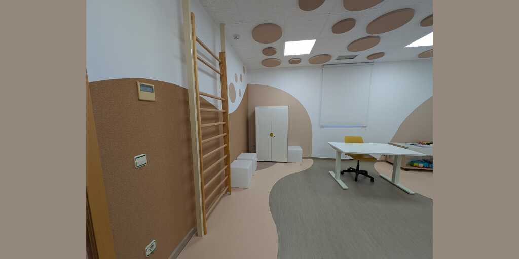 Entre las actuaciones realizadas, destacan la instalación de vinilos decorativos que acompañan el recorrido hasta las salas, creando un entorno visualmente agradable y coherente. Asimismo, se han colocado paneles fonoabsorbentes en el techo, una mejora esencial para reducir el ruido exterior. Las personas dentro del espectro autista pueden presentar una menor tolerancia a las vibraciones sonoras, y los sonidos de fondo, incluso cuando son muy bajos, pueden generar distracciones o provocar reacciones negativas que van desde alteraciones del comportamiento hasta episodios de gran ansiedad. Por ello, la reducción del ruido ambiental es clave para garantizar un entorno terapéutico adecuado.