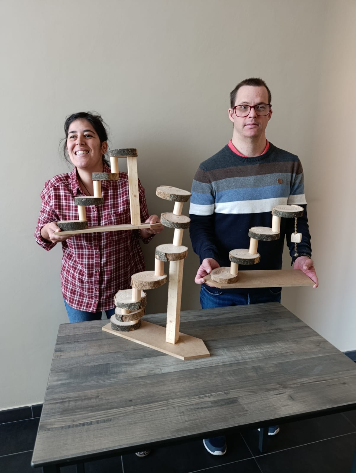 El taller de artesanía y merchandising del Centro Ocupacional de Down Madrid, a través del proyecto “Talento en madera”, impulsado por Down Madrid en colaboración con la Fundación GMP, ha dado un paso más en su compromiso con la sostenibilidad y el cuidado del medio ambiente. En colaboración con el taller de jardinería, hemos visitado el Centro de Recuperación de Animales Silvestres (CRAS) Madrid-Viñuelas para entregar una serie de juguetes diseñados especialmente para enriquecer la vida de las aves que allí se recuperan.