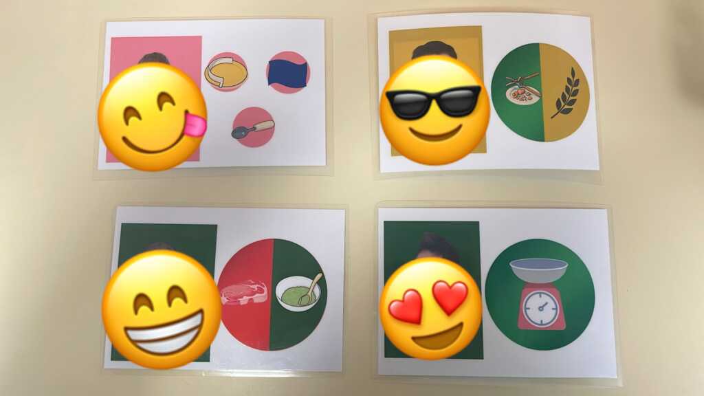 Además, cada alumno dispone de un carné con su fotografía y la información necesaria sobre su alimentación, texturas y apoyos motóricos. El fondo de la foto coincide con el color de su plato, de modo que todo el sistema resulta fácil de identificar y aplicar.