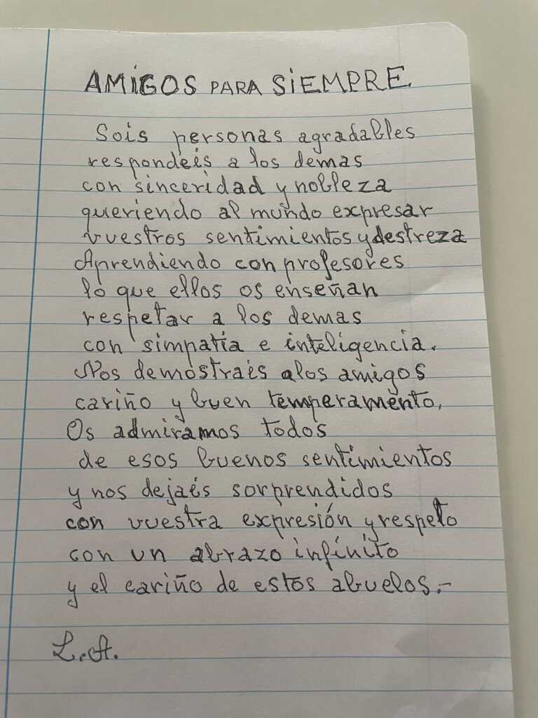 Fruto de este clima de confianza y colaboración, una de las participantes del centro, una persona mayor sin discapacidad intelectual, nos ha sorprendido recientemente con un gesto muy especial: ha escrito una poesía inspirada en los encuentros compartidos y en las personas que participan en la actividad. Sus versos reflejan la emoción, la cercanía y el valor de estas mañanas de viernes, poniendo palabras al sentimiento de comunidad que se ha ido construyendo poco a poco.