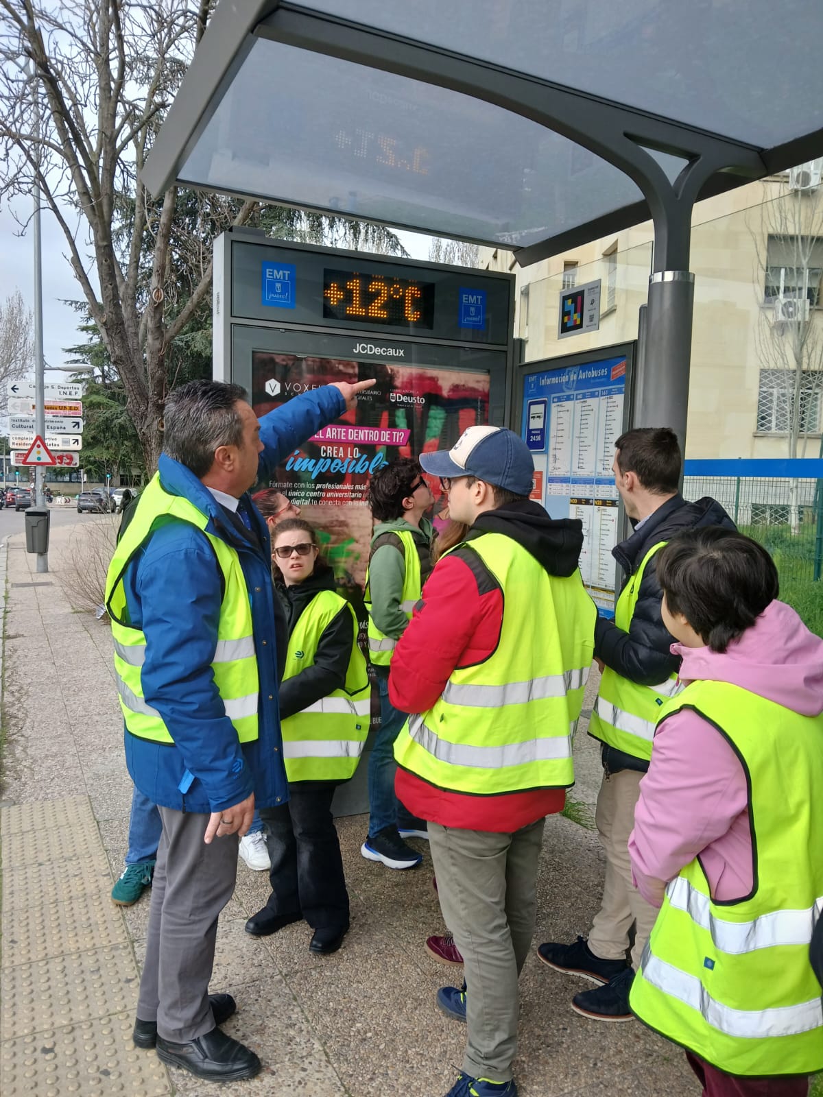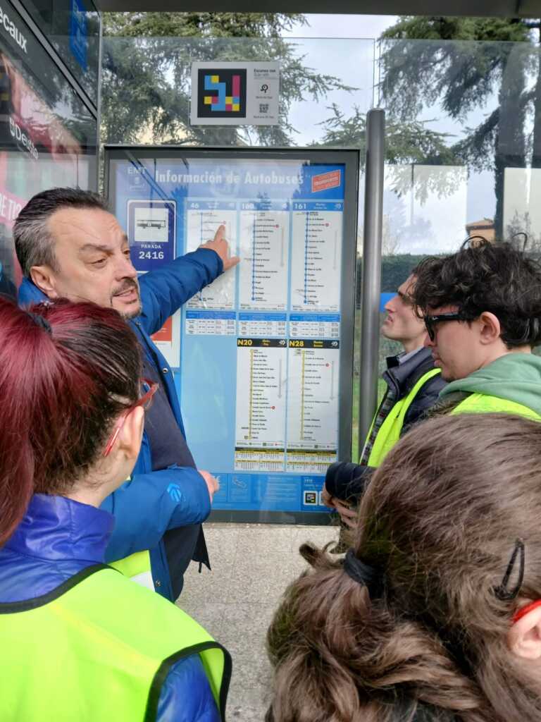 Es muy importante no abusar del móvil para no despistarnos y escuchar música con cascos. En la calle hemos entrenado la orientación y puesta en práctica de lo aprendido con un chaleco amarillo con rayas grises y visto Apps como Navilens o EMTMADRID y mucho más. Aunque nos hemos quedado con ganas de montar en las bicicletas de BiciMAD y de ir al Museo de la EMT.