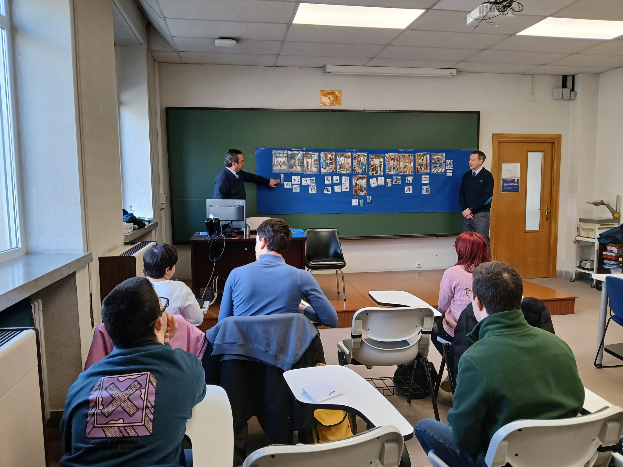 En clase nos han explicado el trabajo de la EMT: los tipos de autobuses, los recorridos y cómo hay que estar en la parada y dentro del autobús, por ejemplo, cómo llevar la mochila o estar sentado, cómo validar el abono o pagar el billete, cómo solicitar la parada, que no hay que correr detrás del autobús (ya que siempre llega otro después), que hay que sujetarse bien a las barras para no caerse y que también señalizan el asiento reservado para las personas con discapacidad visual, y otras necesidades.